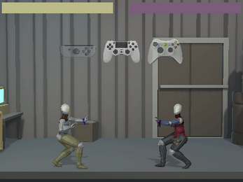 When both players have been claimed with input devices, the fight starts. The fight resets after a player wins. Fight forever; you can't quit.